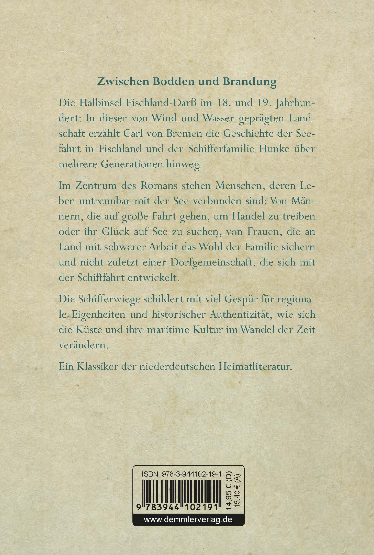 Zwischen Bodden und Brandung – Die Schifferwiege führt die Leser an die raue Ostseeküste des 18. und 19. Jahrhunderts, auf die Halbinsel Fischland-Darß. In dieser von Wind und Wasser geprägten Landschaft erzählt Carl von Bremen die Geschichte der Seefahrt in Fischland und der Schifferfamilie Hunke über mehrere Generationen hinweg: