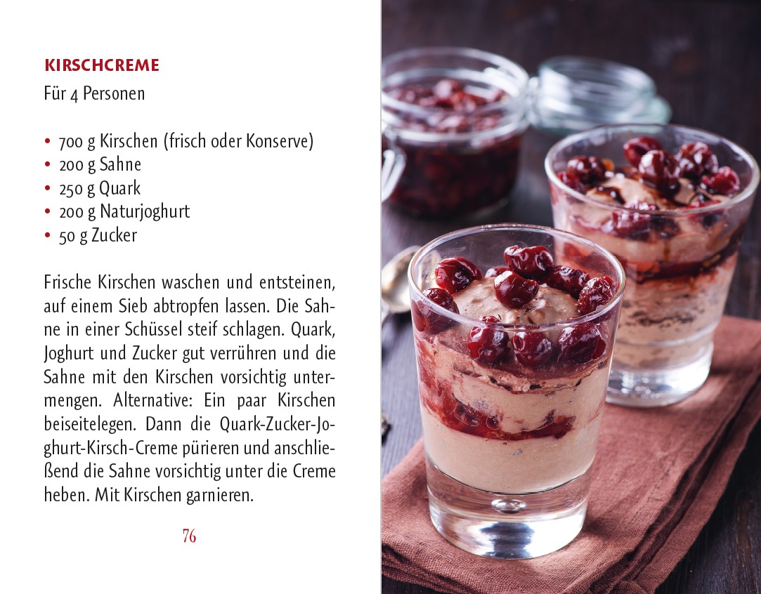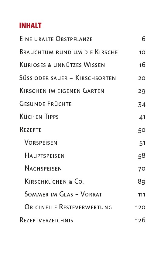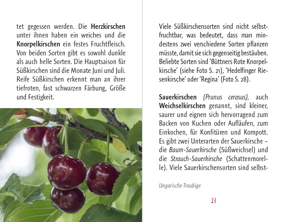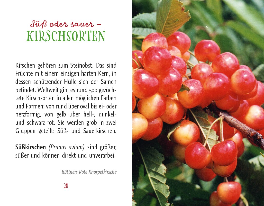 Die Kirschen aus Nachbars Garten sollen bekanntlich die besten sein. Woher die leckeren Früchte ursprünglich stammen und wie sie nach Europa (und in Nachbars Garten) gelangten, erzählt der kompakte kleine Ratgeber wie auch Wissenswertes zu Symbolik, Brauchtum und Kirschen-Festen. Wer selbst gärtnerisch tätig werden möchte, bekommt ebenso Tipps wie alle, die Kirschen kaufen und nicht sofort vernaschen, sondern auf köstliche Art kulinarisch verwerten wollen – für pikante Beilagen zu Fleischgerichten, leckeres Gebäck, zarte Desserts, fruchtige Konfitüre und Kirschsaft.
