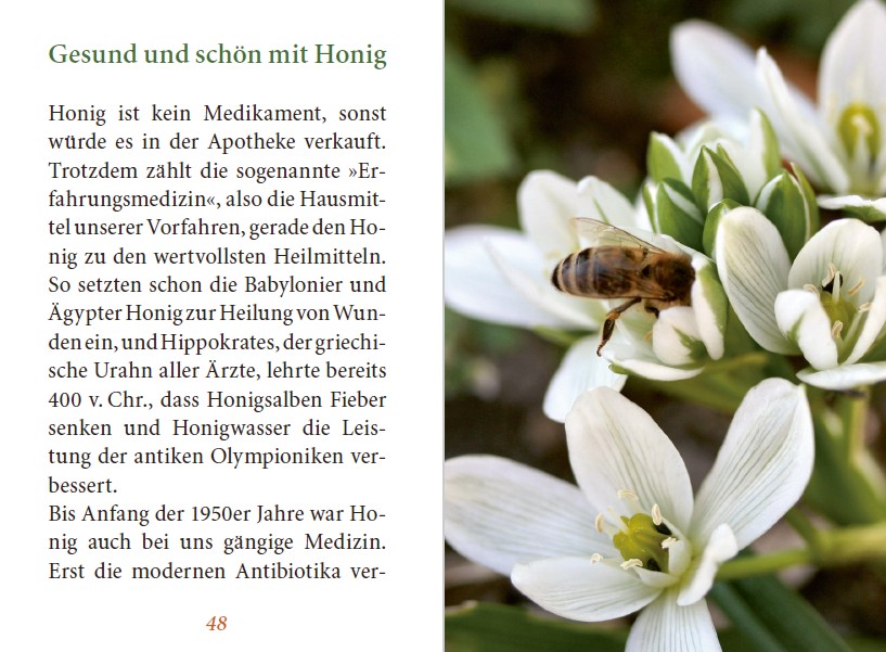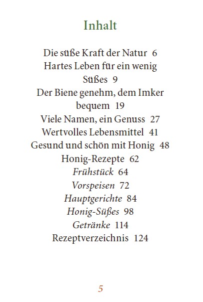 Der Ratgeber erzählt Wissenswertes aus der Welt der Bienen und Imker, von der Herstellung des Honigs, seiner Sortenvielfalt und den gesunden Inhaltsstoffen, der Verwendung als Heil-, Schönheits- und gesundes Lebensmittel. Neben Rezepten zur Pflege und Gesunderhaltung bietet der Band zahlreiche verlockende Back- und Kochideen vom süßen Frühstück über pikante Speisen, leckere Kuchen und Süßigkeiten bis zu geistvollen Getränken.
