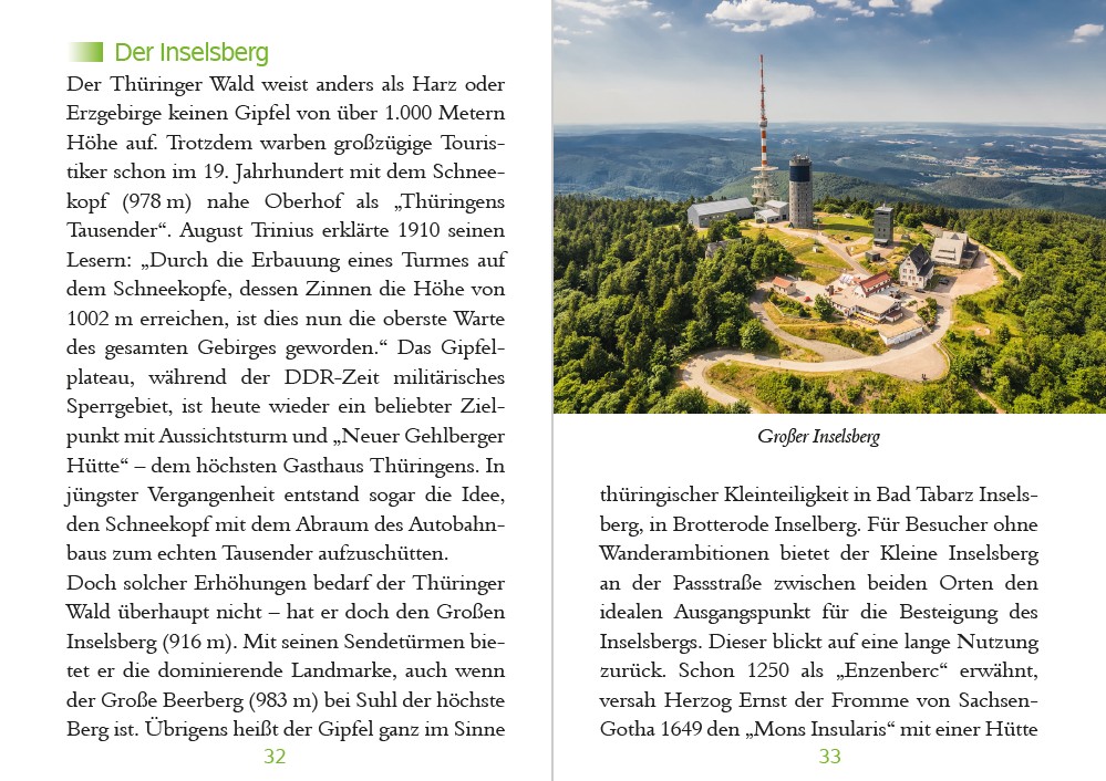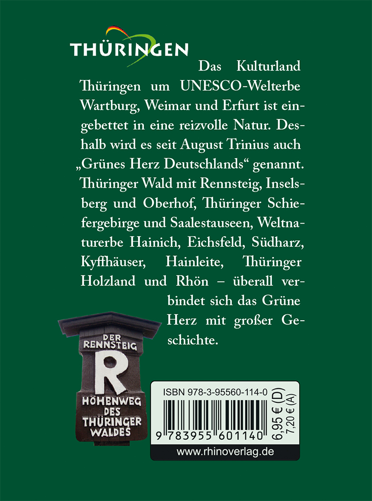 All dies ist eingebettet in eine reizvolle Natur. Deshalb wird Thüringen seit Ende des 19. Jahrhunderts auch „Grünes Herz Deutschlands“ genannt. Schöpfer der Marke ist Wanderschriftsteller August Trinius. In jüngster Zeit wurde das seit Generationen emotional fest verwurzelte Motto der Thüringer auch vom Freistaat wieder aufgegriffen. Thüringer Wald mit Rennsteig, Inselsberg und Oberhof, Thüringer Schiefergebirge und Saalestauseen, Weltnaturerbe Hainich, Eichsfeld, Südharz, Kyffhäuser, Hainleite, Thüringer Holzland und Rhön – überall verbindet sich das Grüne Herz mit großer Geschichte.
