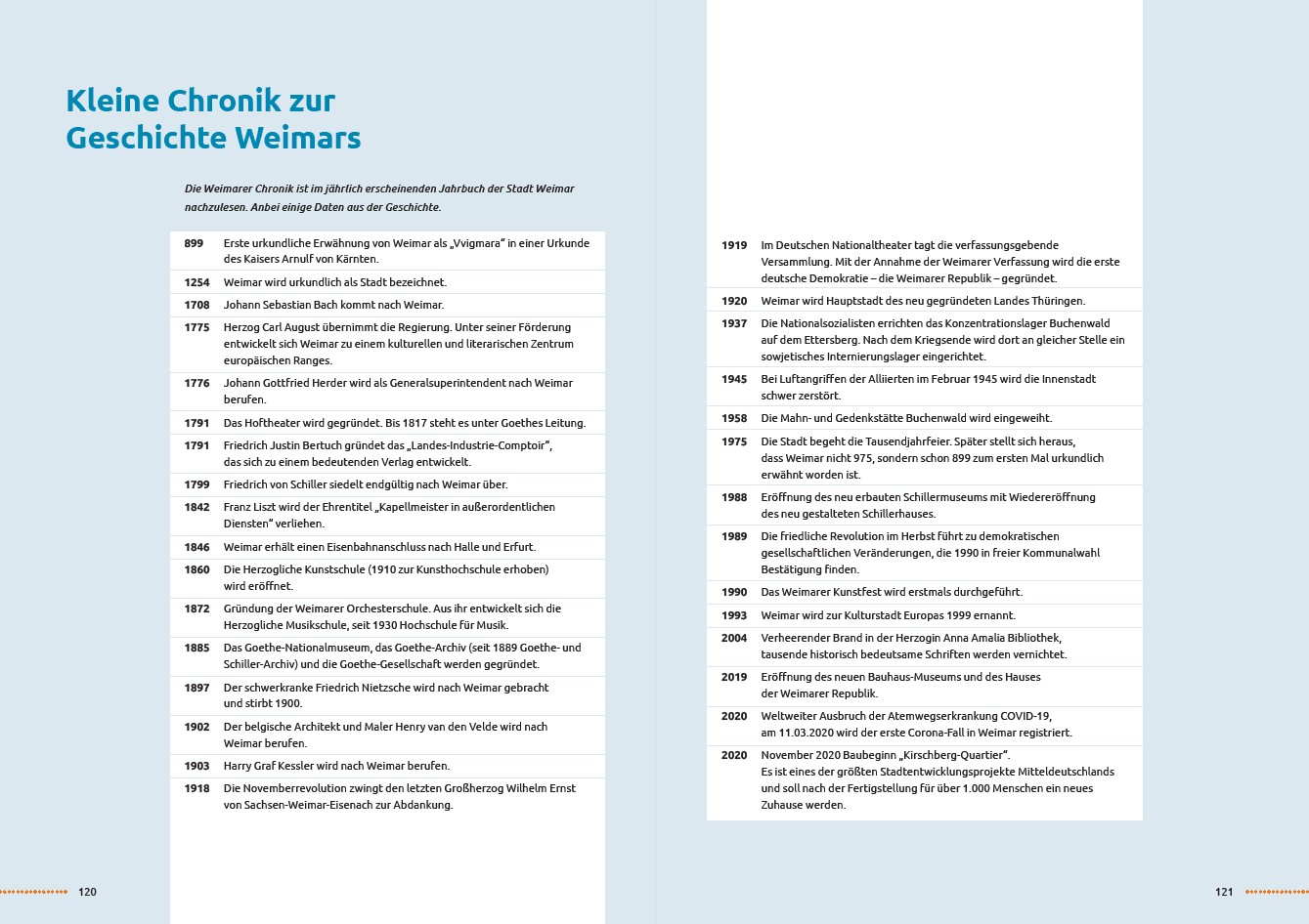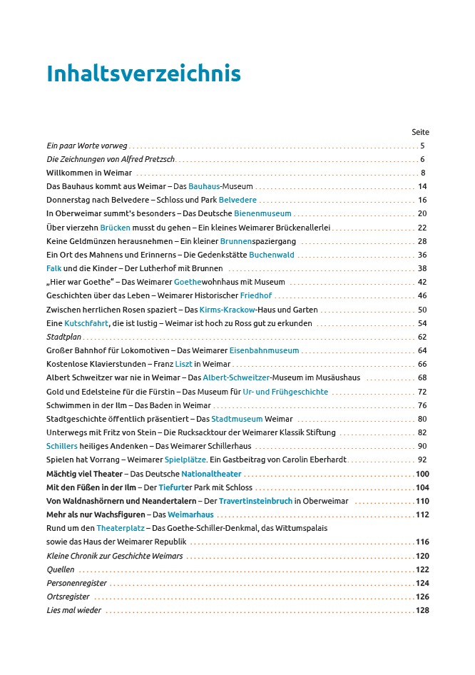 Neben den Fotografien der Autorin ergänzen Weimarer-Zeichnungen von Alfred Pretzsch die Reiseempfehlungen. Die 25 Kapitel sollen anregen, sich auf individuelle Spurensuche zu begeben, dabei gleichfalls als Nachschlagewerk für eigene Recherchen dienen.